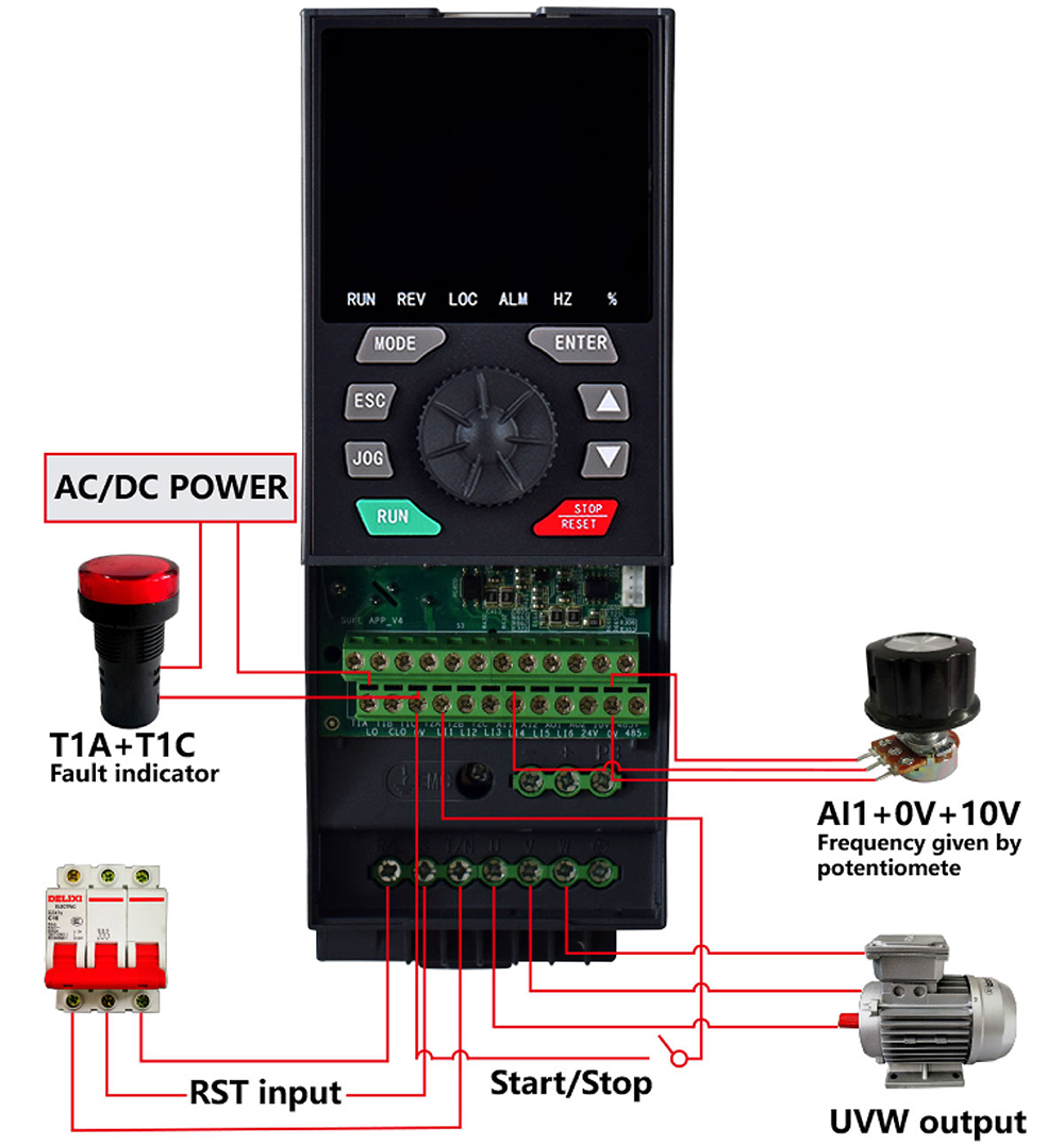 | Signal de réglage de fréquence | Panneau de commande intégré | Interrupteur à membrane (bouton), bouton de vitesse (potentiomètre) |