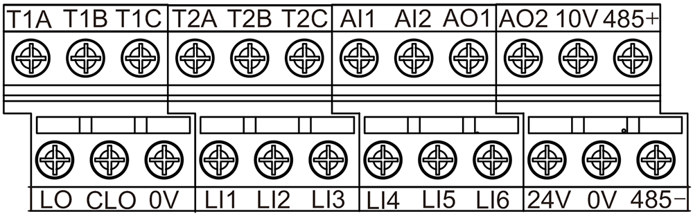| Entrée logique | LI1-LI8 | Alimentation 0-24 V CC La logique positive (source) et la logique négative (puits) sont facultatives et la valeur par défaut est la logique négative. Marche avant, marche arrière, réinitialisation des défauts, multi-vitesse et 69 autres fonctions sont facultatives Les produits de moins de 15 kW (inclus) n'ont que LI1-LI6 |