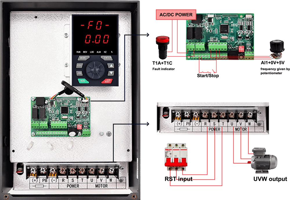 | Signal de réglage de fréquence | Panneau de commande intégré | Interrupteur à membrane (bouton), bouton de vitesse (potentiomètre) |