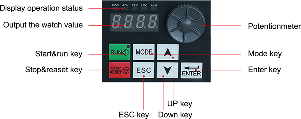 | Signal de réglage de fréquence | Panneau de commande intégré | Interrupteur à membrane (bouton), bouton de vitesse (potentiomètre) |