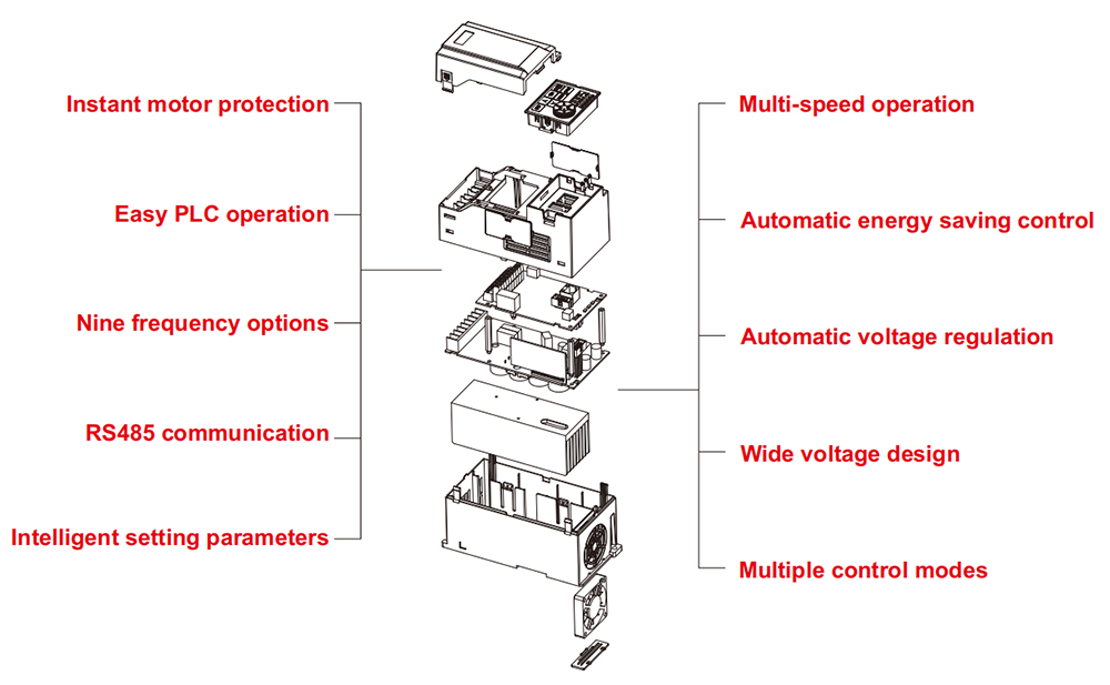 | Fréquence de commutation | 1,5 kHz-12 kHz La fonction de réglage automatique de la fréquence de commutation peut être réglée : lorsque la température augmente, la fréquence de commutation est automatiquement réduite Lorsque la température revient à la normale, la fréquence de découpage revient à la valeur initiale |