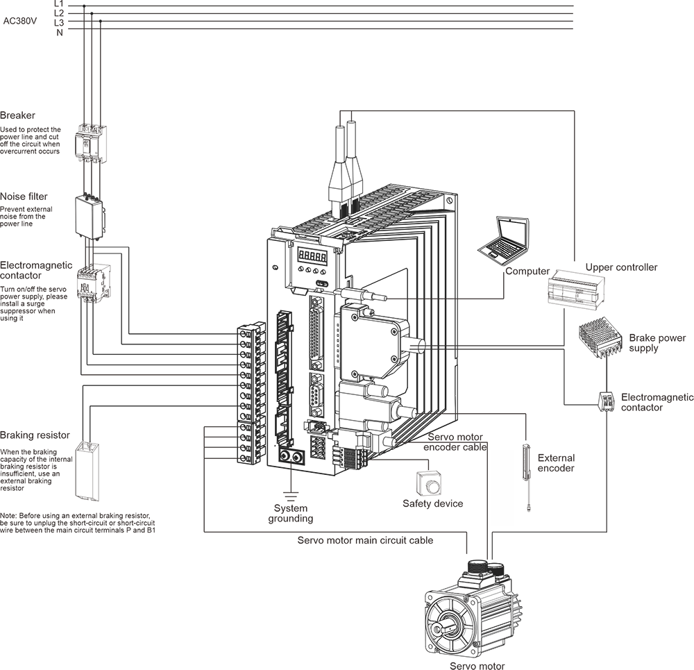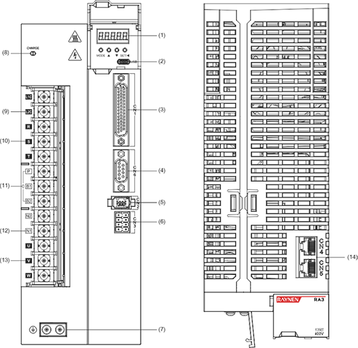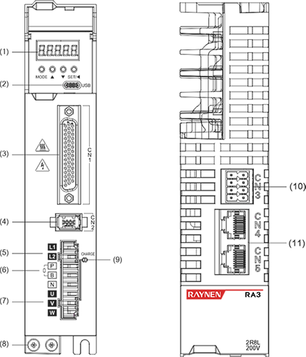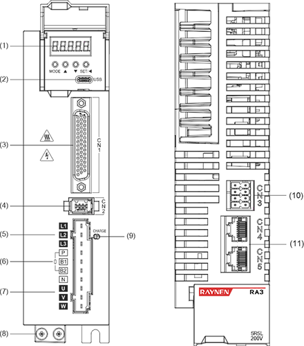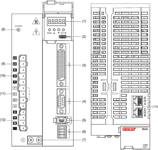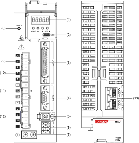 | Descriptif : ① Affichage du tube numérique : tube numérique LED à 5 chiffres et 8 segments ②USB : interface USB Type-C, connectée au PC ③CN1 (connecteur d'interface) : port de connexion du signal de sortie/entrée, connecté à un contrôleur programmable (PLC) ou à des E/S de contrôle ④Connecteur d'encodeur entièrement fermé : interface entièrement fermée, connectée au deuxième encodeur externe, le modèle « -FS » prend en charge cette fonction ⑤CN2 (connecteur codeur) : interface codeur, connectée à l'encodeur du servomoteur ⑥L1, L2, L3 (bornes d'entrée d'alimentation principale) : alimentation du circuit principal, l'alimentation monophasée est connectée entre L1 et L2 (200 ~ 240 VAC, alimentation 50/60 Hz) ⑦L1C, L2C (électronique d'entrée d'alimentation de contrôle) : alimentation du circuit de commande, connectée à une alimentation monophasée (200~240VAC ou 380~440VAC, alimentation 50/60Hz selon le modèle) ⑧R, S, T (bornes d'entrée d'alimentation principale) : alimentation du circuit principal, à connecter à une alimentation triphasée (200 ~ 240 VAC ou 380 ~ 440 VAC, alimentation 50/60 Hz selon le modèle) ⑨P, B (borne de connexion de la résistance de freinage externe) : utiliser une résistance de freinage externe ⑩P, B1, B2 (borne de connexion de la résistance de freinage externe) : utilisez une résistance de freinage externe (retirez la pièce de court-circuit entre P et B1, connectez-la aux deux extrémités de P et B2) ⑪P, N (N1, N2) (borne de bus servo) : ne retirez pas la pièce de court-circuit entre N1 et N2, connectez entre P et N (N1) pour que plusieurs servos partagent le bus DC ⑫N1, N2 : connectez le réacteur CC externe (retirez la pièce de court-circuit), court-circuitez lorsqu'il n'est pas utilisé ⑬U, V, W, PE (borne de connexion du servomoteur) : sortie du servomoteur, connectée au connecteur d'alimentation du moteur (U, V, W, PE) ⑭ Vis de mise à la terre : connectez-la à la terre d'alimentation et à la terre du moteur. ⑮CHARGE (indicateur de tension du bus) : indicateur d'alimentation ⑰CN3 (connecteur pour fonction de sécurité) : interface STO, seuls les modèles « -S/FS » prennent en charge cette fonction ⑱CN4/CN5 (terminal de communication) : port de communication 485, port de communication haut débit EtherCAT, port de communication CAN | |||||||||