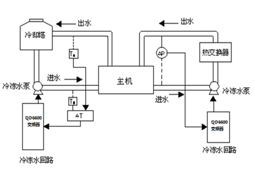 | 04 introduction au système : Dans ce système, deux pompes à eau glacée de 110 kW sont entraînées par deux onduleurs D71 de 110 kW, et il existe également plusieurs onduleurs D71 qui entraînent des ventilateurs (y compris des ventilateurs intérieurs et des ventilateurs de tour de refroidissement). Dans le système de circulation d'eau glacée, le signal 1 (signal de température ou signal de pression) du circuit d'entrée d'eau et le signal 2 (signal de température ou signal de pression) du circuit de sortie d'eau sont envoyés au module analogique pour obtenir le signal de retour analogique de l'onduleur. Grâce à la fonction PID intégrée de l'onduleur, le contrôle automatique en boucle fermée est réalisé. | | ||||||||||||||||||